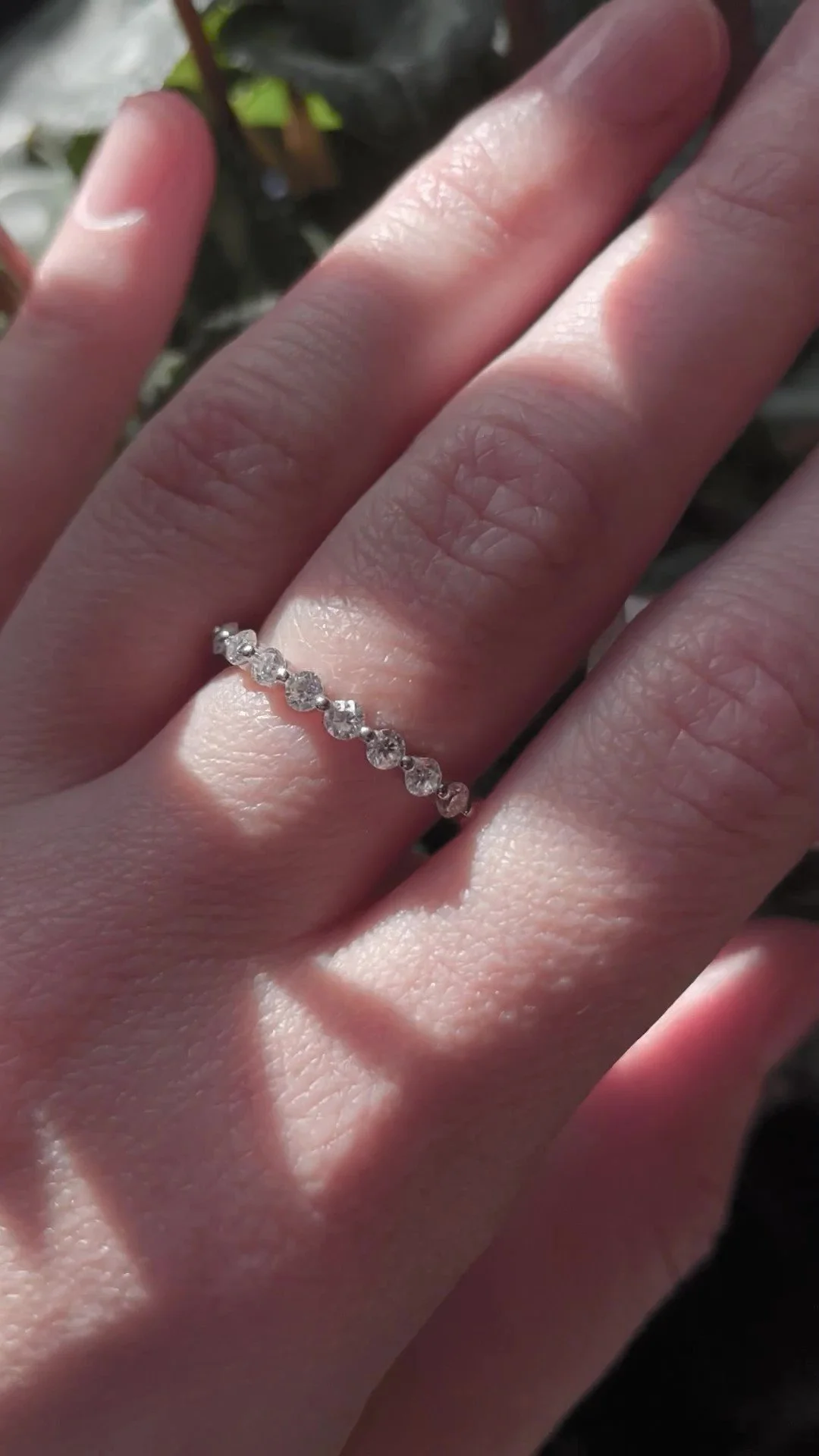 A row of sixteen diamonds in a shared claw setting on a platinum band. Also available in Moissanite/Karbinite.
