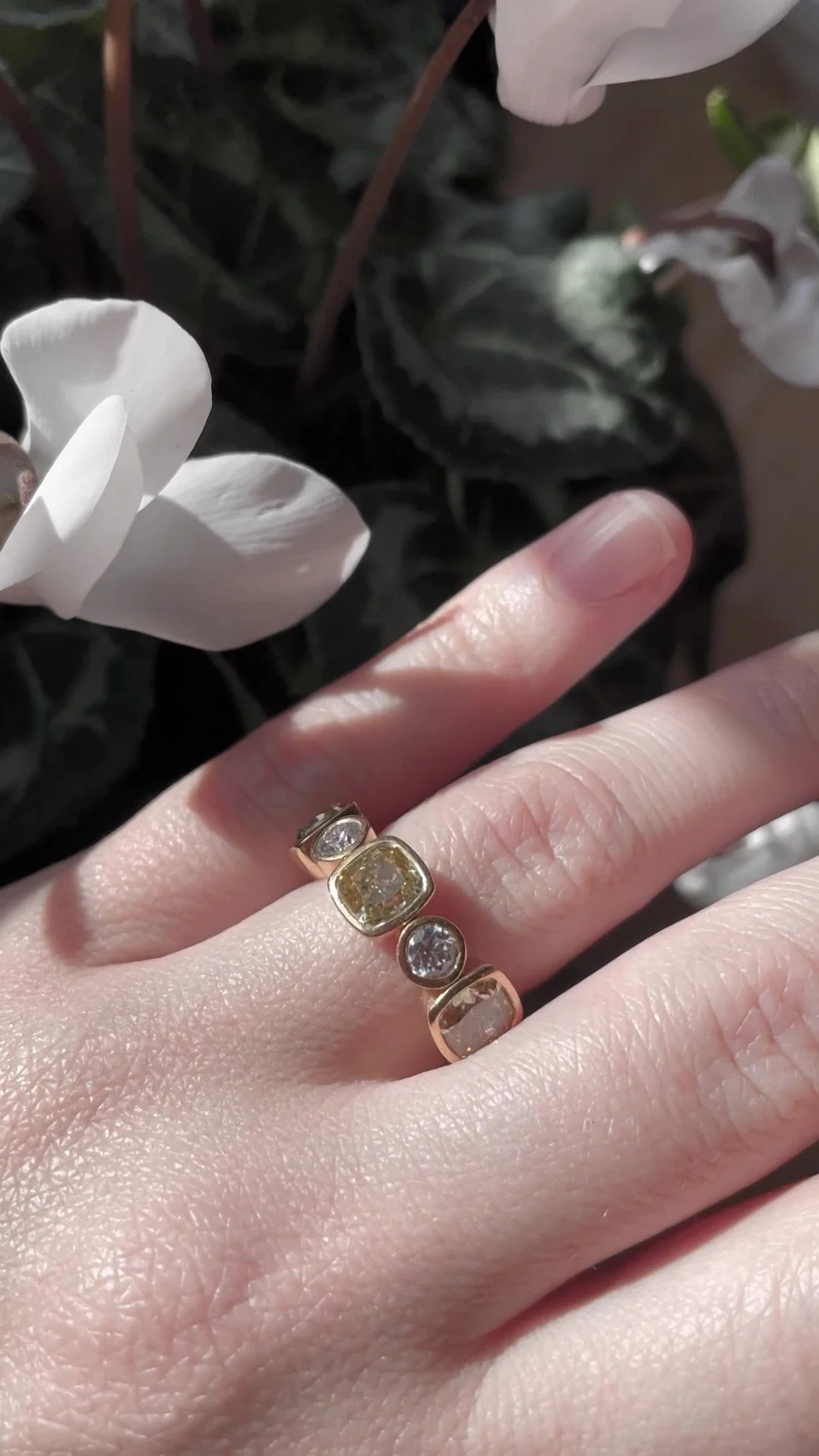 A Moissanite dress band with alternating clear round and yellow cushion stones set in an 18ct gold band.