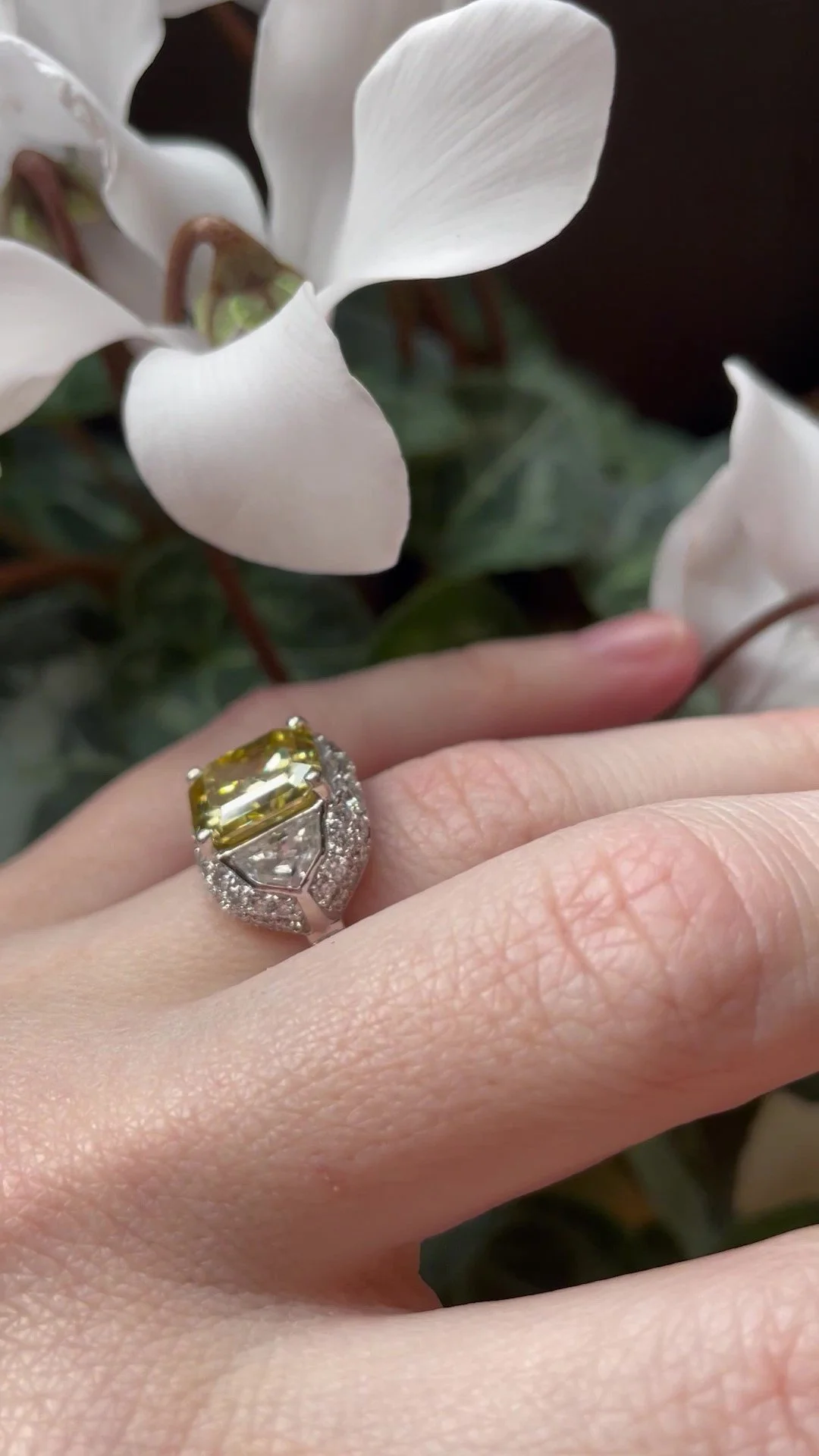 A showstopping diamond and Moissanite ring, with a central yellow asscher-cut Moissanite flanked by shield-cut Moissanite stones, surrounded with a diamond pave halo and claw set diamonds down the platinum band.