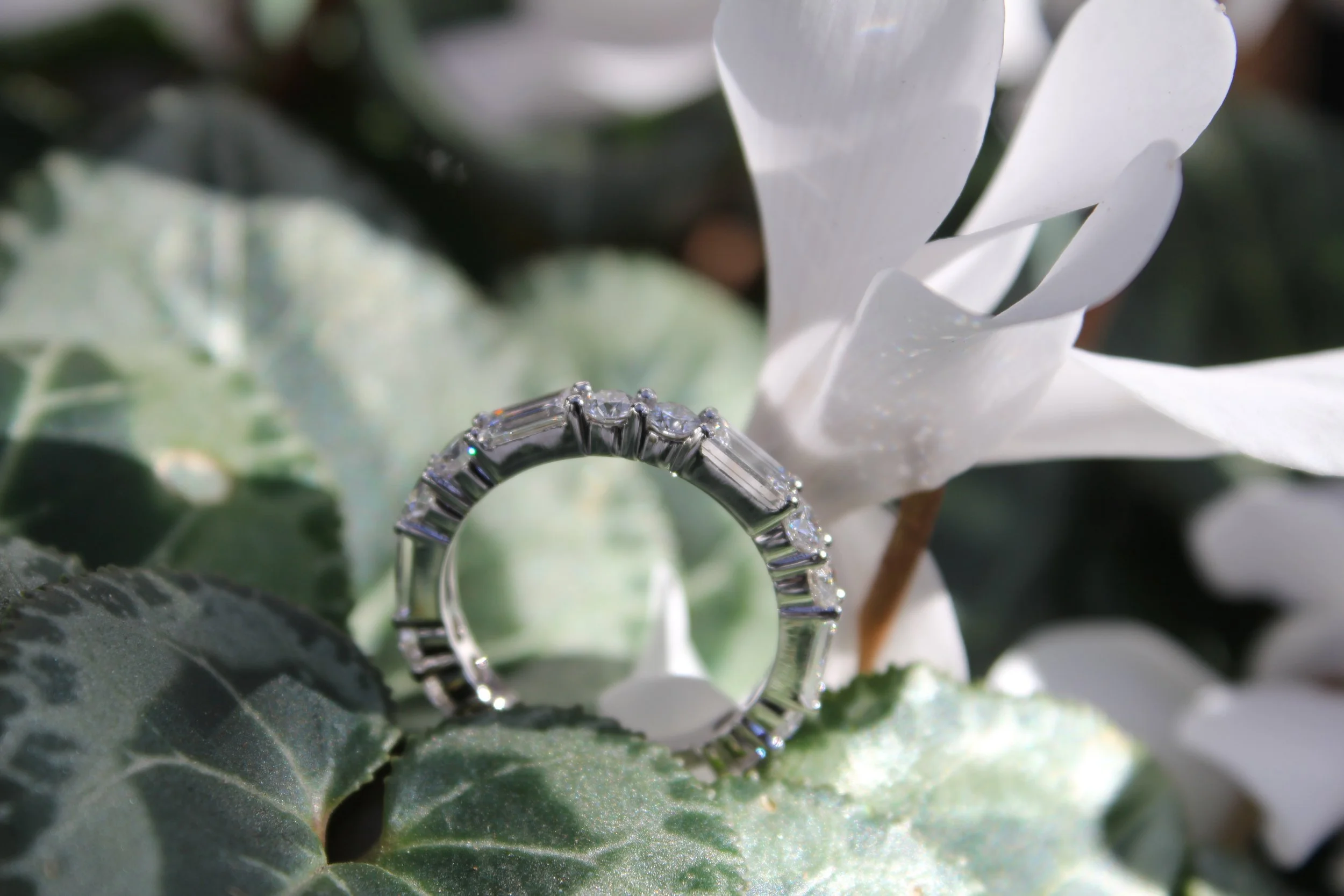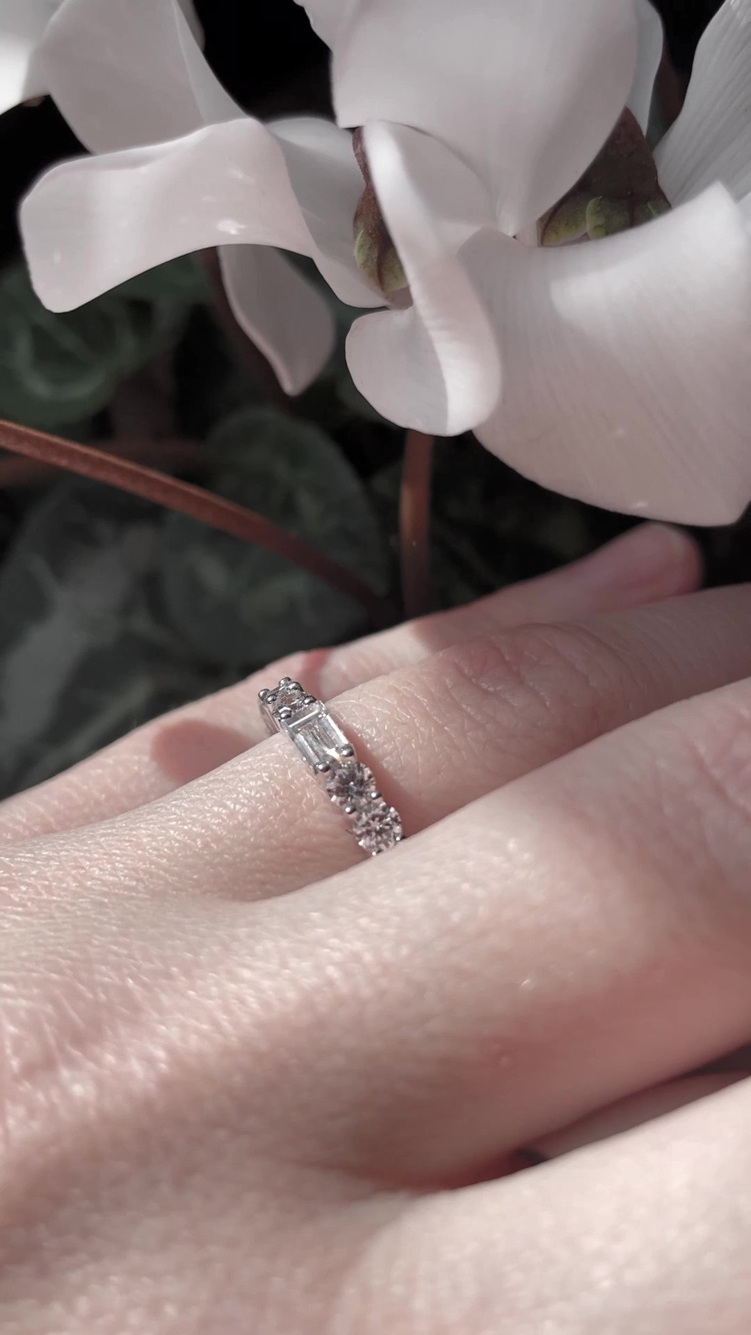 A diamond eternity band with alternating round and rectangular settings on an 18ct white gold band. Also available in Moissanite/Karbinite.