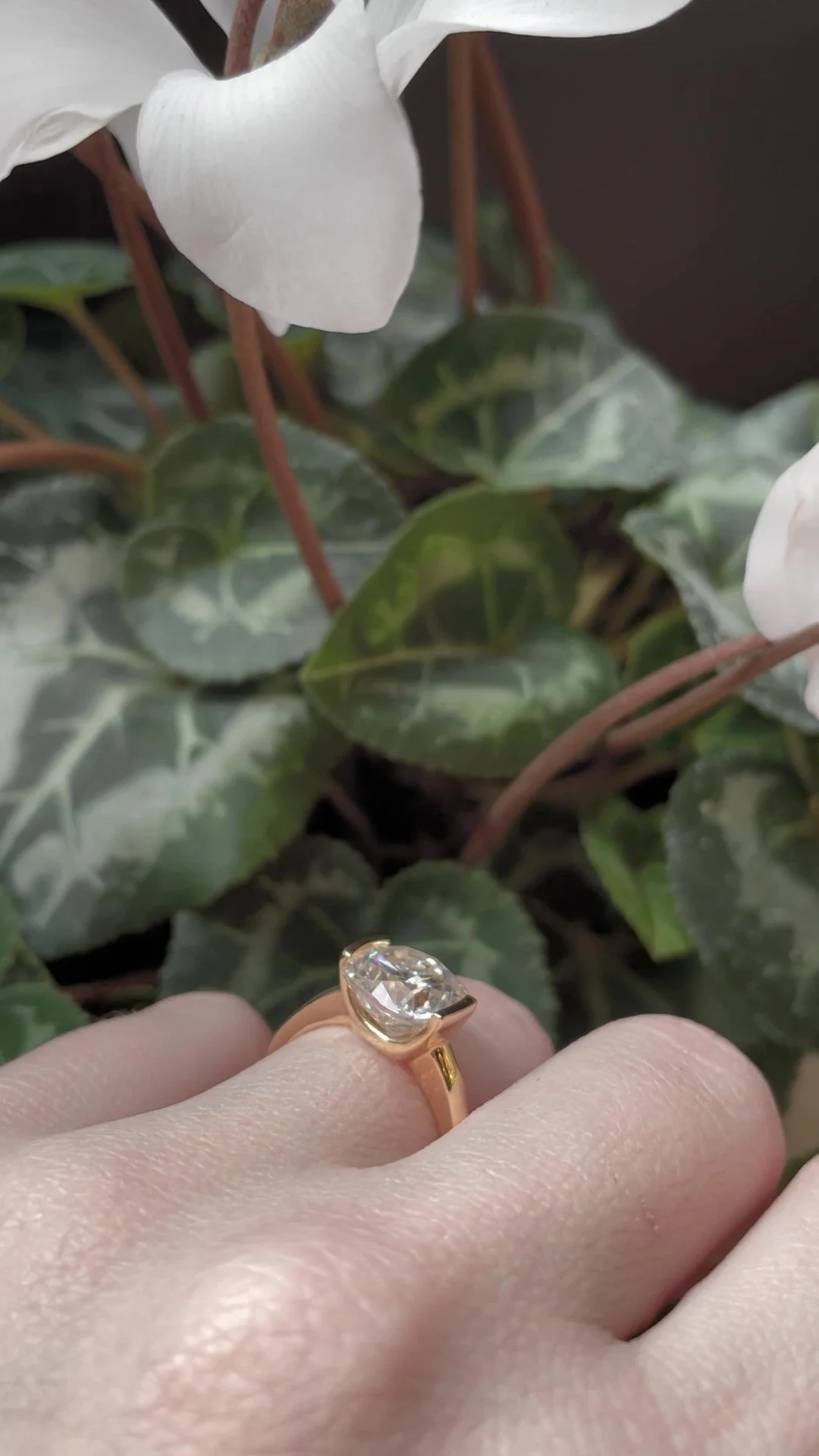 A Moissanite solitaire in a central semi-bezel U-shaped setting with open sides, featuring a clear cushion cut stone on a 14ct gold band.
