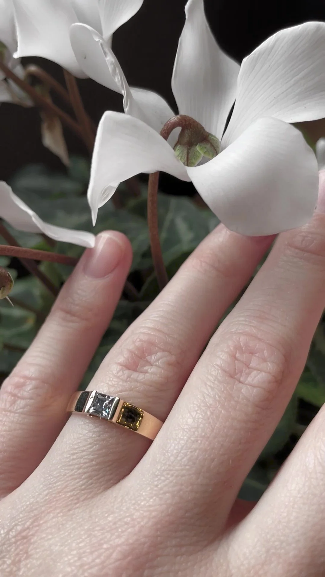 A light blue princess-cut Moissanite in a tension setting with triangular under-rail in a wide 14ct gold band.